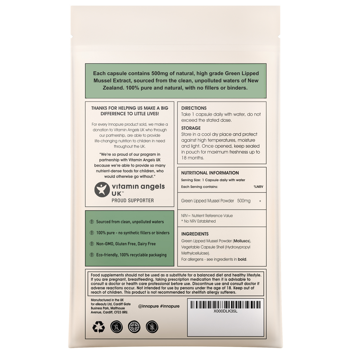 Innopure® Green Lipped Mussel Capsules contain 100% pure and high grade Green Lipped Mussel Powder. Provides a rich source of amino acids, omega 3 fatty acids & glycosaminoglycan