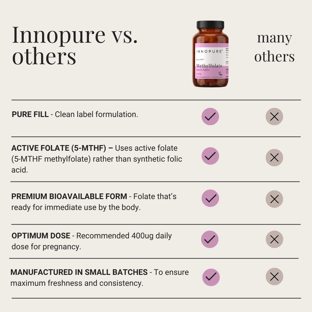 Innopure Active Methylfolate contains the effective dose of 400ug per capsule which is the level advised by the Department of Health. It is recommended that women planning a baby should take Foate for at least one month before and up to three months after conception. Supplemental Folate intake increases maternal folate status. Low maternal folate status is a risk factor in the development of neural tube defects in the developing foetus.